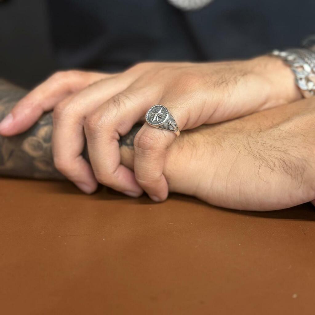 1. Anel de Prata Redondo Bussola com Ancoras nas Laterais
