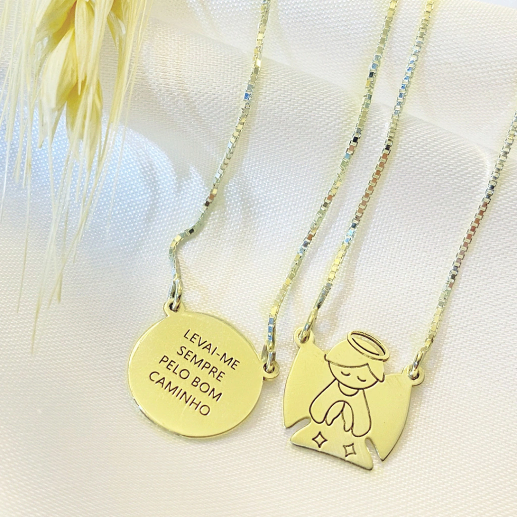1. Escapulário Personalizado de Prata Veneziana Tradicional, Anjo com Banho de Ouro
